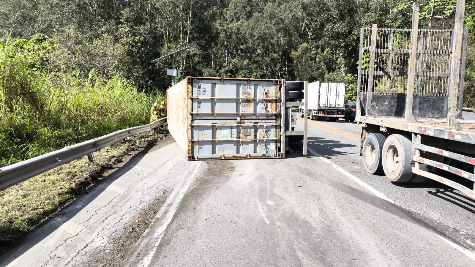 Carreta carregada de madeira tomba na BR-470 em Ibirama nesta quarta-feira (9) e motorista é levado ao hospital