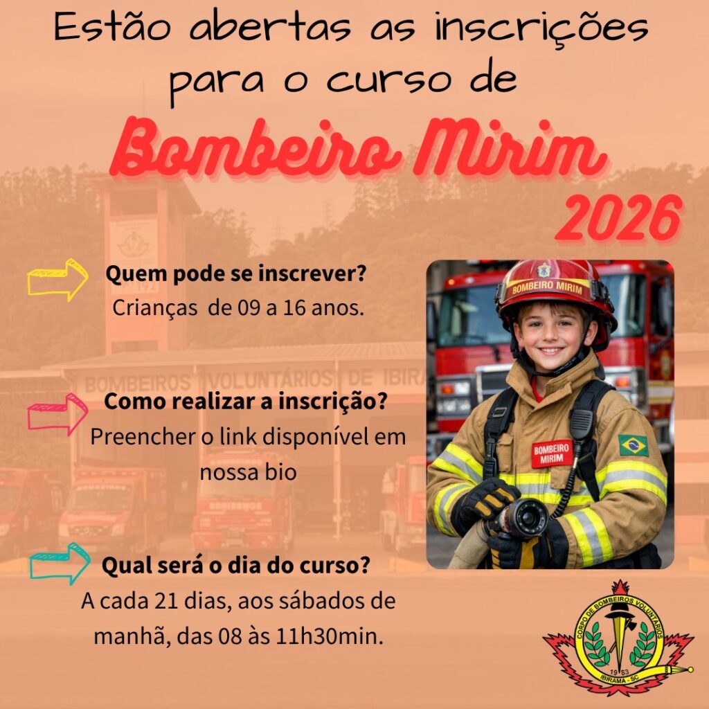 Estão abertas as inscrições para o Curso de Bombeiro Mirim 2026, promovido pelos Bombeiros Voluntários de Ibirama. O anúncio foi feito pelo comandante Rudinei Pinsegher, que reforça o convite aos pais e responsáveis interessados em proporcionar às crianças e adolescentes uma experiência educativa voltada à cidadania, disciplina e noções básicas de prevenção e atendimento a emergências.“Nós temos um recado muito importante para você, pai, mãe ou responsável por criança ou adolescente na faixa etária entre 9 anos completos e 16 anos ou 17 a completar”, afirmou o comandante.