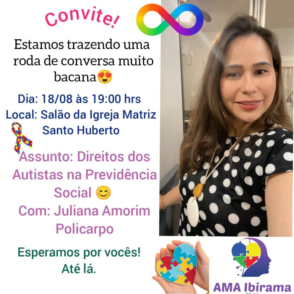 Nesta segunda-feira, dia 18, a AMA promove uma roda de conversa sobre direitos dos autistas na Previdência Social, com a participação da palestrante Juliana Policarpo, do INSS. O encontro será realizado no Salão da Igreja Católica, no Centro de Ibirama, às 19h, e é aberto a todos.
