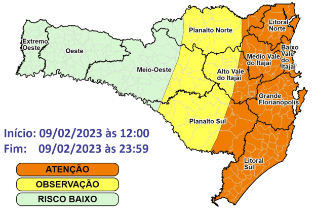 Elaborado em: 09/02/2023 às 07:30 – N° 023/2023 Meteorologista: Caio Guerra Quinta-feira (09) com condições para chuva intensa em Santa Catarina. Os maiores acumulados são esperados entre a tarde e a noite, nas áreas do Litoral Sul, Grande Florianópolis, Vale do Itajaí e Litoral Norte, onde o risco é alto para alagamentos, enxurradas e danos associados a […]