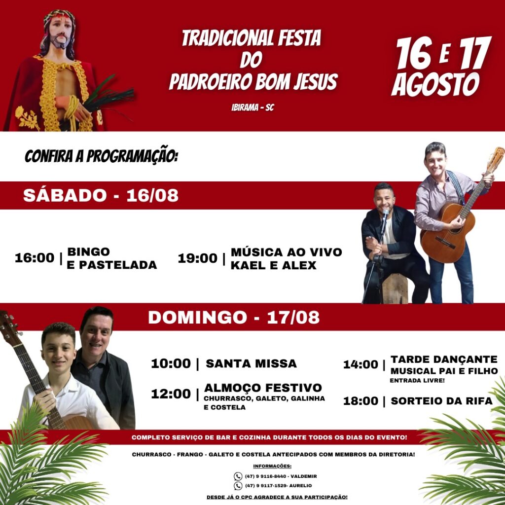 Os bairros Bela Vista e Progresso, em Ibirama, realizam neste fim de semana, dias 16 e 17 de agosto, a Tradicional Festa do Padroeiro Senhor Bom Jesus. O evento, que já é parte do calendário comunitário da cidade, promete reunir fé, gastronomia, música e momentos de confraternização para toda a família.