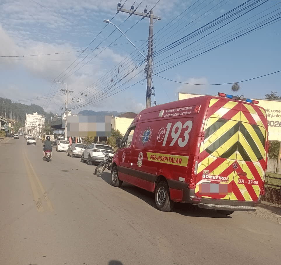 Os Bombeiros Voluntários de Presidente Getúlio foram acionados por volta das 7h35 desta quarta-feira, 11, para atender uma colisão entre um carro e uma motocicleta na Rua Mirador, no Centro do município.