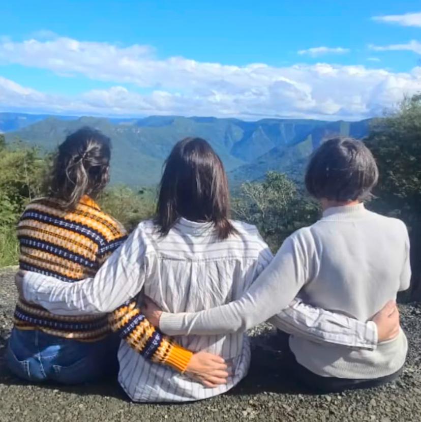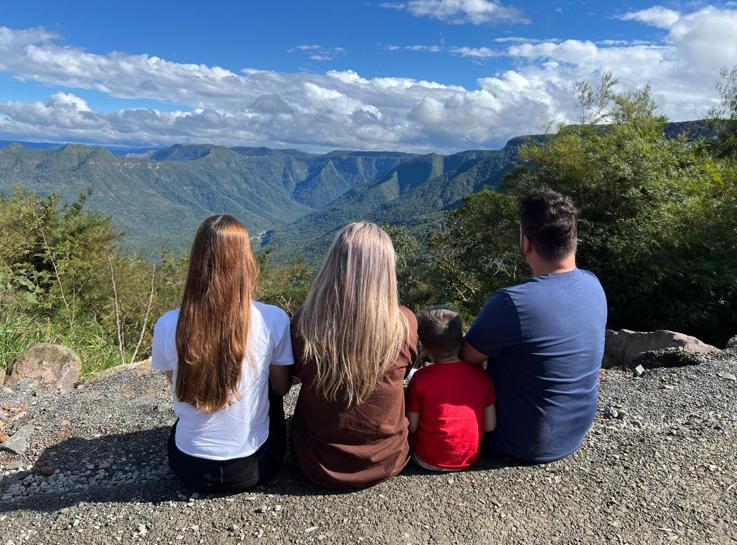 Na sexta-feira, o casal e os filhos decidiram subir a serra e conhecer os cânions. Em um dos mirantes, encontraram três mulheres — uma mãe e duas filhas — e, em um breve momento de convivência, tiraram uma foto do trio. “Elas foram muito simpáticas. A mãe arrumou o cabelo da minha filha e minha blusa para que a foto saísse bonita. Em retribuição, elas tiraram uma foto nossa também”, lembra.