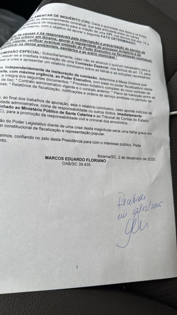Atualização: O advogado e morador de Ibirama Marcos Eduardo Floriano encaminhou, no dia 2 de dezembro, um requerimento dirigido ao presidente da Câmara Municipal, vereador Saulo Eduardo Fonseca, solicitando a abertura de procedimentos para investigar a crise no serviço de coleta de lixo no município. No entanto, o assunto não estava na pauta da sessão desta segunda-feira, dia 8, e, segundo informações da própria Câmara, o autor não havia protocolado nenhum pedido oficial sobre o tema. Mais tarde, a Casa Legislativa confirmou que o pedido foi enfim protocolado. “O Marcos Floriano veio hoje a tarde aqui e dai foi protocolado o pedido dele. Hoje será feito a leitura“, informou a assessoria de imprensa. Anteriormente a assessoria havia informado que preponente havia enviado apenas um e-mail, sem qualquer solicitação formal adicional.