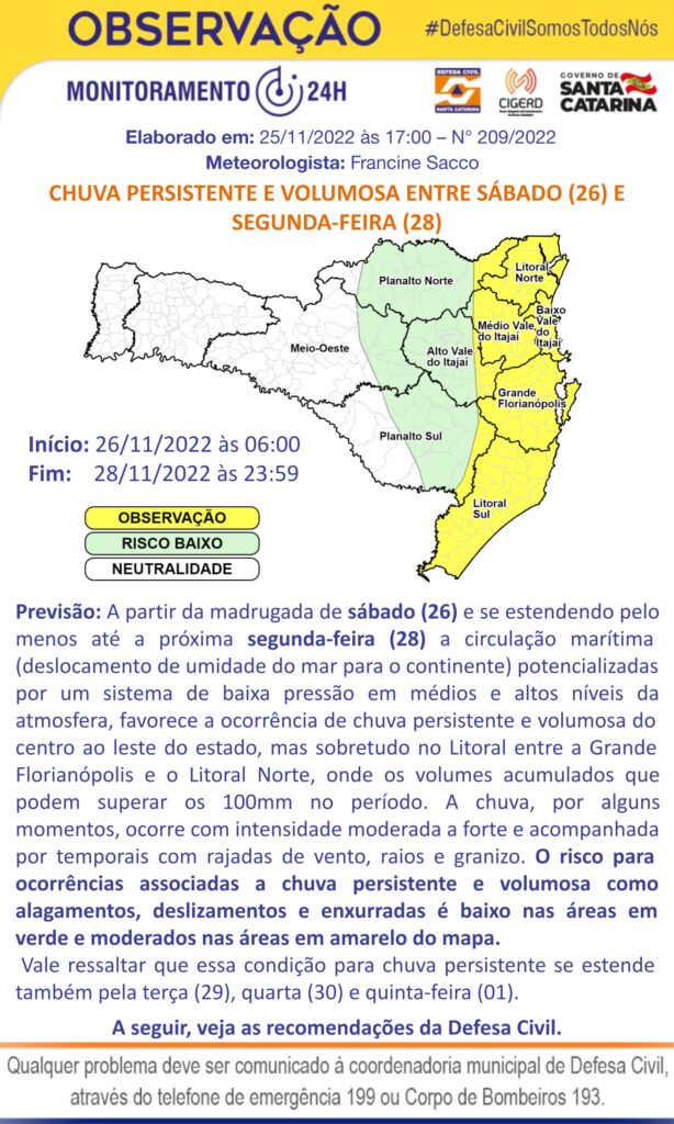 Defesa Civil: Chuva persistente e volumosa entre hoje (26) e segunda-feira (28)