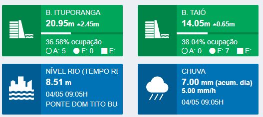 Outras informações como o nível do rio Itajaí-Açu e detalhes do nível das barragens, podem ser acompanhados em tempo real no mesmo site.