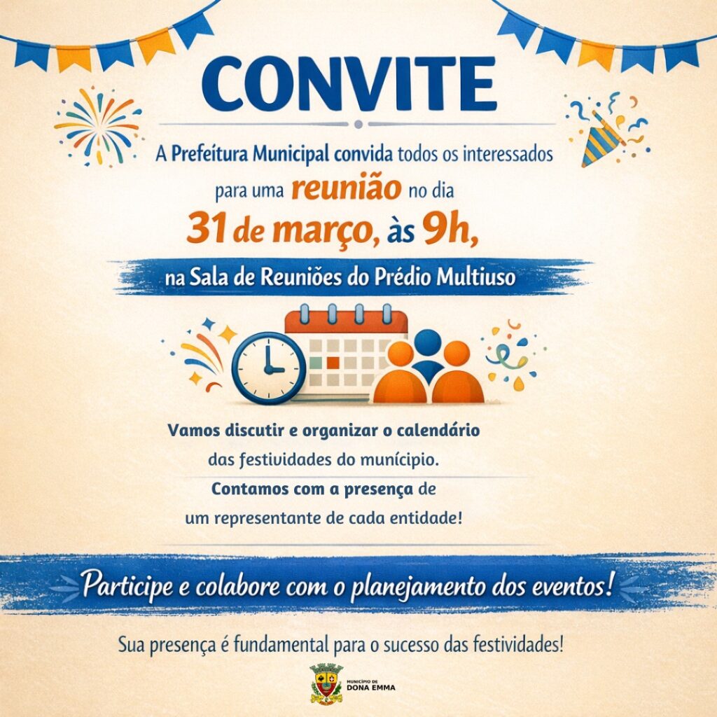 DONA EMMA – A Prefeitura de Dona Emma realiza, às 9h da próxima terça-feira (31), uma reunião aberta a representantes de entidades locais para a elaboração do calendário oficial de eventos do município. O encontro ocorrerá na sala de reuniões do prédio Multiuso.