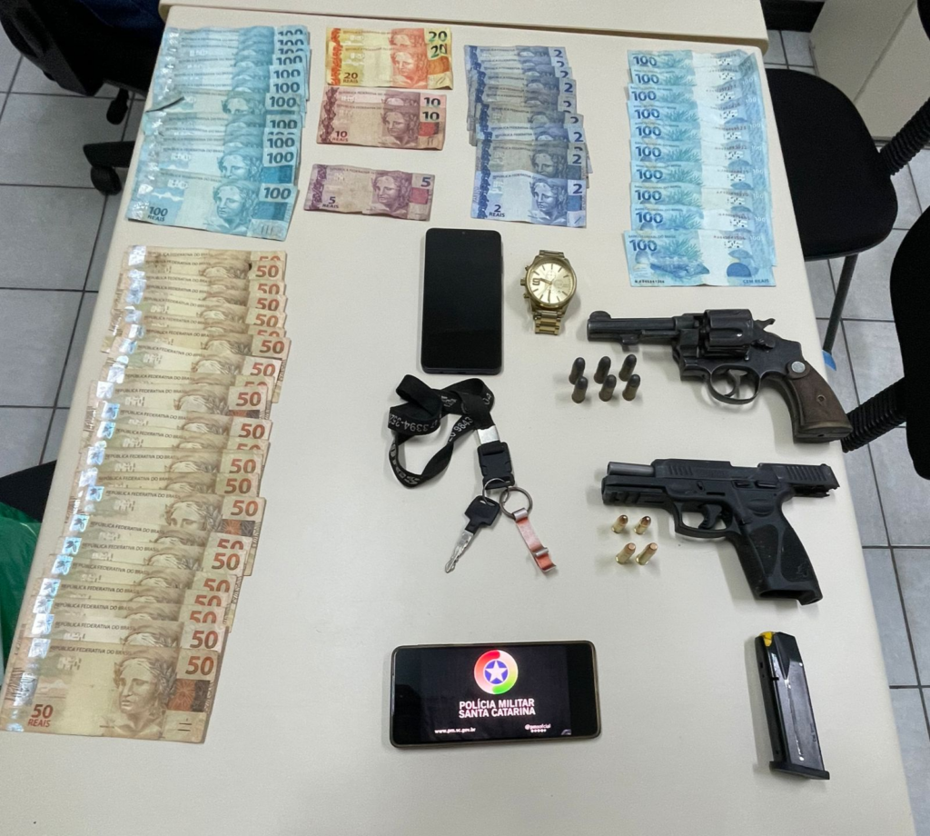 Durante a revista, os policiais encontraram com a dupla um revólver calibre .45 municiado com seis munições, uma pistola Taurus G3 com duas munições, além de dinheiro em espécie e um celular.