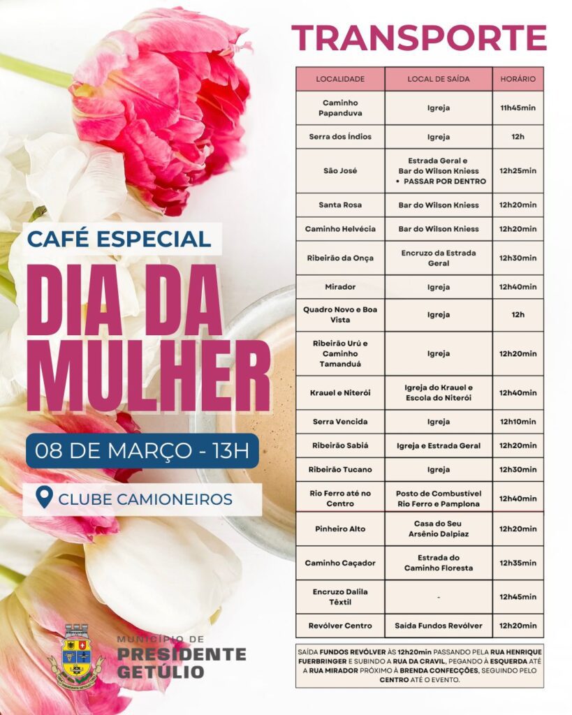 Em alusão ao Dia Internacional da Mulher, Presidente Getúlio promove no próximo 8 de março um encontro especial dedicado ao público feminino. A programação inicia às 13h, no Clube Camioneiros, e promete uma tarde de acolhimento, celebração e integração entre as participantes.