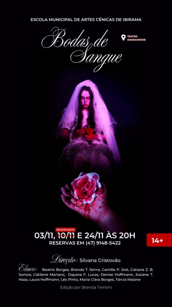 A Escola Municipal de Artes Cênicas de Ibirama convida a comunidade para prestigiar o espetáculo “Bodas de Sangue”, inspirado na obra clássica de Federico García Lorca. A montagem promete uma experiência intensa e emocionante, com uma história marcada por paixão, destino e tragédia, interpretada por um talentoso elenco de jovens artistas ibiramenses.