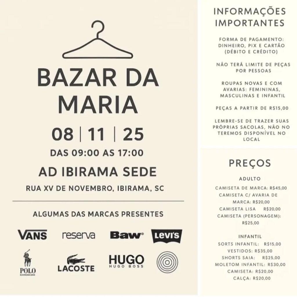 O bazar solidário acontecerá das 9h às 17h, na Assembleia de Deus – Sede de Ibirama, localizada na Rua XV de Novembro, e contará com roupas novas e peças com pequenas avarias — femininas, masculinas e infantis — com preços a partir de R$ 15,00.