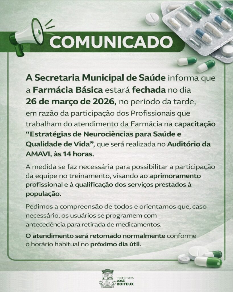 JOSÉ BOITEUX – A Secretaria Municipal de Saúde de José Boiteux informou que a Farmácia Básica da cidade estará fechada no período da tarde desta quinta-feira, 26 de março de 2026. A interrupção ocorre devido à participação da equipe em um treinamento técnico.