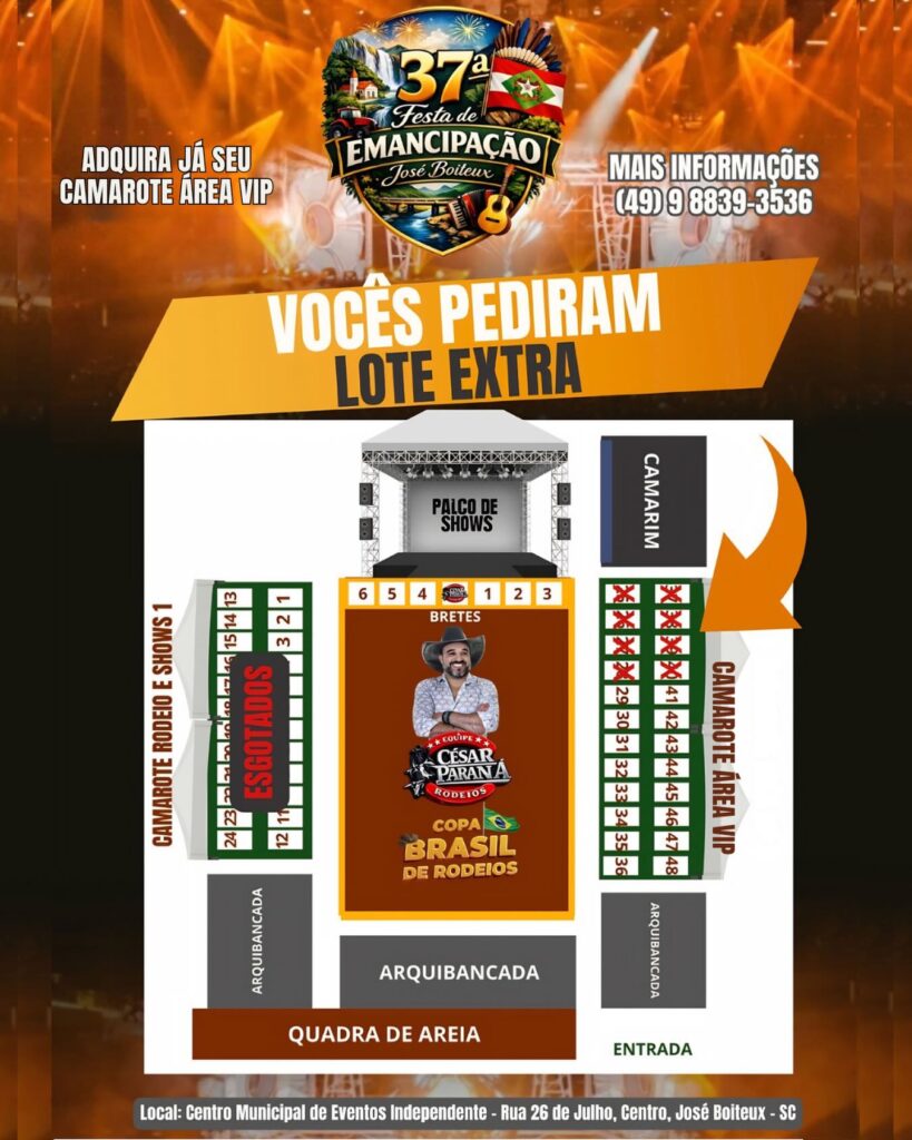 JOSÉ BOITEUX – A Comissão Organizadora da grande festa de José Boiteux anunciou a liberação de um lote extra de Camarotes e ingressos para a Área VIP. A medida visa atender à alta demanda do público que busca mais conforto e uma visão estratégica para acompanhar as principais atrações do evento.