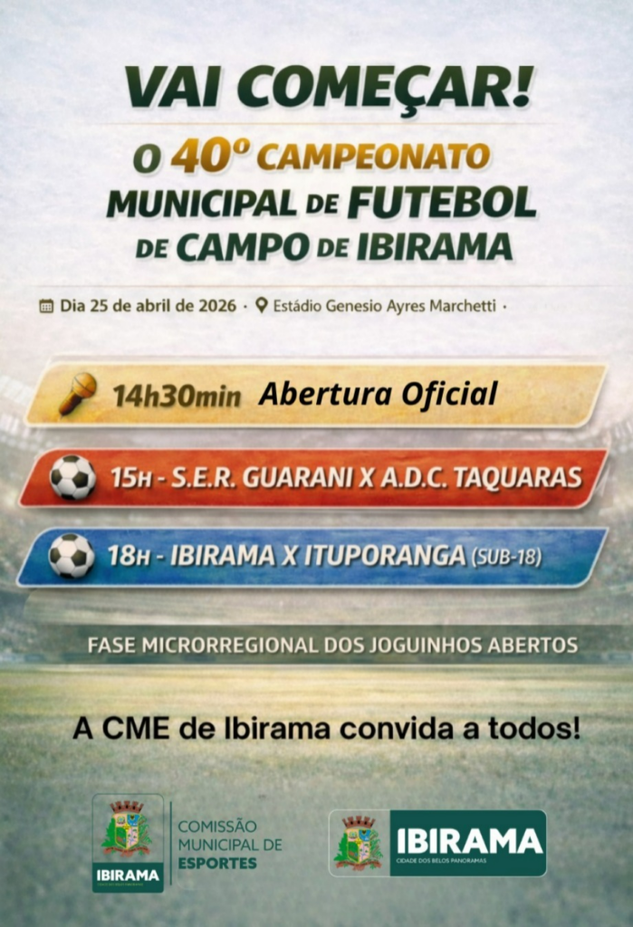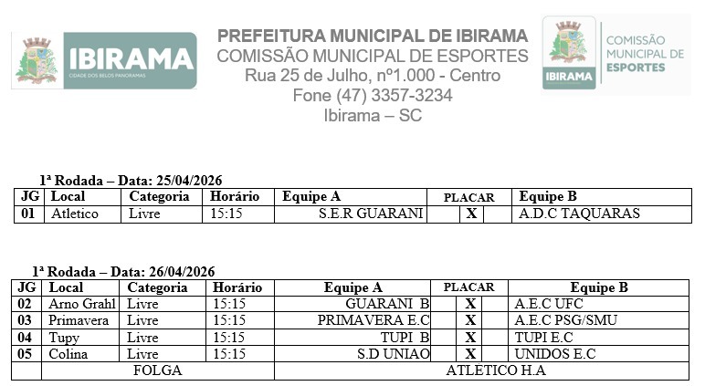 A 40ª edição do Campeonato Municipal de Futebol de Campo de Ibirama começa neste sábado (25), com abertura oficial às 14h30 no Estádio Genésio Ayres Marchetti. Logo depois, às 15h, S.E.R. Guarani e A.D.C. Taquaras fazem o jogo inaugural, dando início a uma das competições mais tradicionais do calendário esportivo do município.