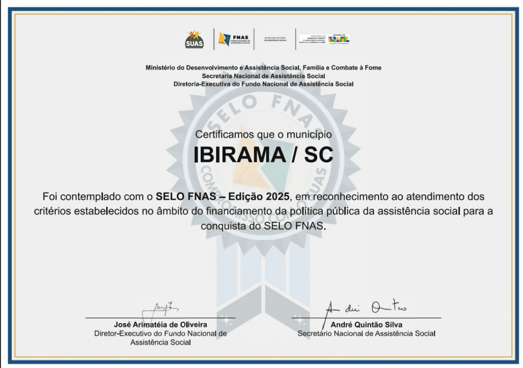 O município de Ibirama foi reconhecido com o Selo FNAS – Edição 2025, uma importante certificação concedida pelo Governo Federal aos entes que cumprem os critérios estabelecidos para a correta gestão dos recursos destinados à assistência social.