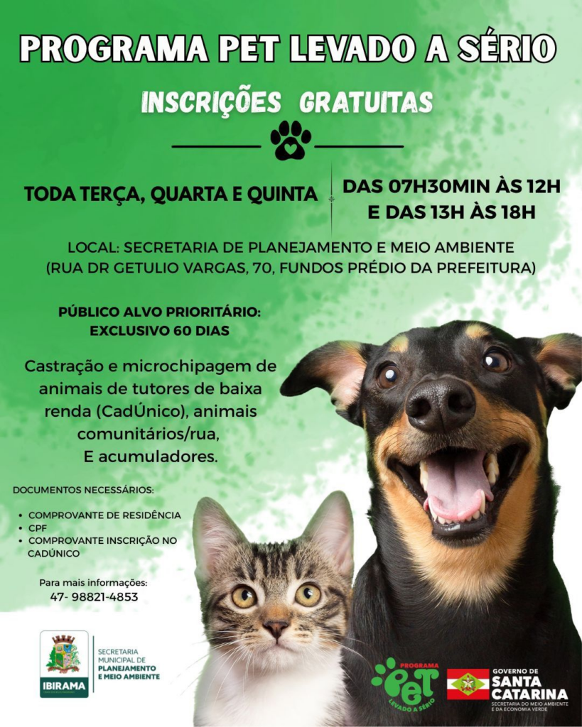 A Prefeitura de Ibirama, por meio da Secretaria Municipal de Planejamento e Meio Ambiente, informa que seguem abertas as inscrições para o Programa Pet Levado a Sério, que oferece castração e microchipagem gratuitas para cães e gatos.