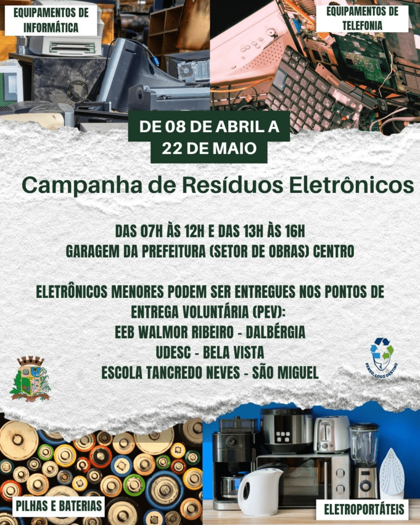 A Prefeitura de Ibirama está promovendo uma Campanha de Coleta de Resíduos Eletrônicos, com o objetivo de incentivar o descarte correto e consciente de equipamentos que não têm mais utilidade. A ação ocorre entre os dias 8 de abril e 22 de maio.