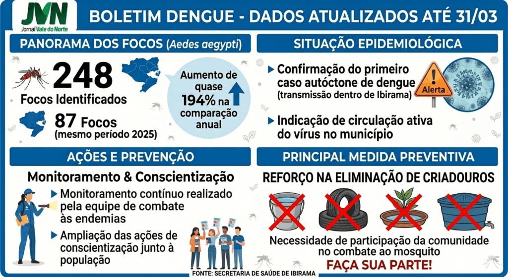 Ibirama vive um cenário de atenção crescente no enfrentamento à dengue em 2026. Levantamento aponta que, até 31 de março, o município registrou 248 focos do mosquito Aedes aegypti, transmissor da dengue, Zika e chikungunya. O número representa um aumento de quase 200% em relação ao mesmo período de 2025, quando haviam sido identificados 87 focos.