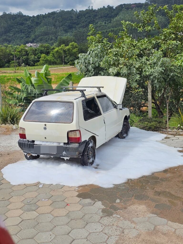 Uma equipe de combate a incêndios foi acionada e, ao chegar ao local, constatou que as chamas já haviam sido controladas pelo proprietário de um Fiat Uno. O veículo estava estacionado no pátio de uma empresa quando o dono percebeu o início do fogo.