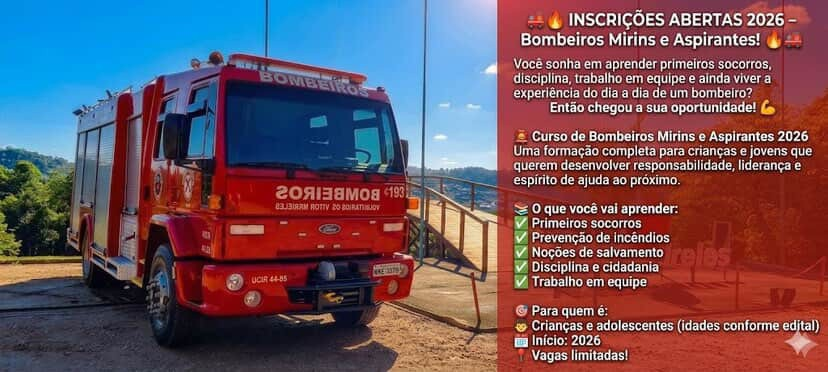 Estão abertas as inscrições para o programa Bombeiro Mirim e Aspirante, promovido pelos Bombeiros Voluntários de Vitor Meireles. O prazo para se inscrever é de 30 dias, e as vagas são limitadas.