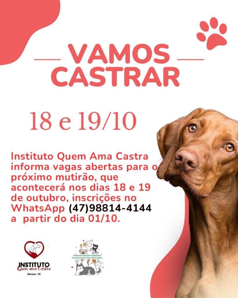 O Instituto Quem Ama Castra anunciou que estão abertas as vagas para o próximo mutirão de castração de animais em Ibirama, que será realizado nos dias 18 e 19 de outubro.