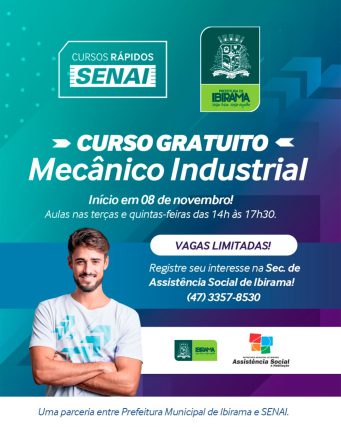 A Prefeitura de Ibirama, por meio da Secretaria de Assistência Social, e em parceria com o SESI/Senai, informa que restam 15 vagas para o Curso de Mecânico Industrial. As vagas são limitadas e as inscrições devem ser feitas até sexta-feira, 4, na Secretaria de Assistência Social de Ibirama. Para evitar filas, os horários de atendimento poderão ser agendados por meio do telefone 3357-8530. Os candidatos devem ter mais de 18 anos, portar documentos pessoais e Carteira de Trabalho.