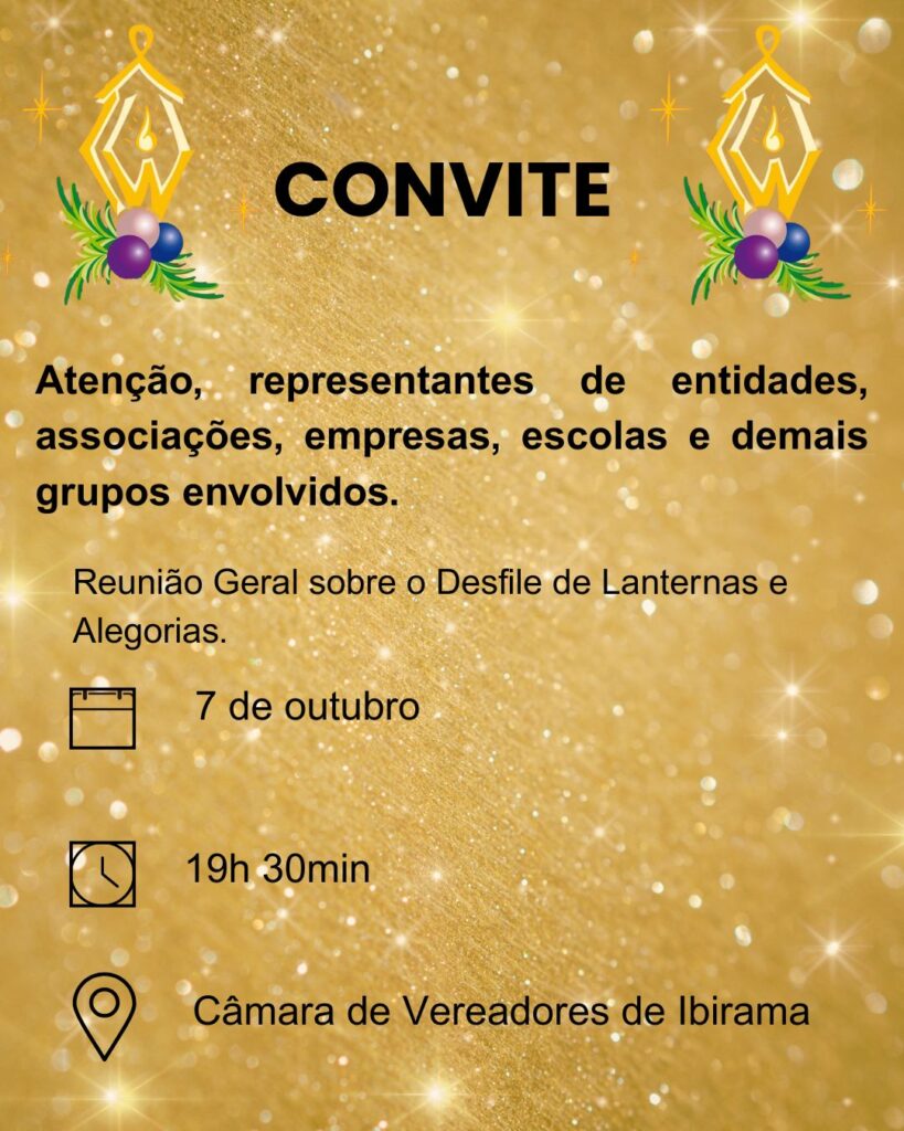 A Administração Municipal de Ibirama realizará, nesta terça-feira, dia 7 de outubro, uma Reunião Geral com representantes de entidades, associações, escolas, empresas e demais grupos interessados em participar do tradicional Desfile de Lanternas e Alegorias. O encontro está marcado para as 19h30, na Câmara de Vereadores de Ibirama, e tem como objetivo alinhar informações e coordenar a organização desta que é uma das atrações mais simbólicas do Weihnachtsmarkt – Mercado de Natal de Ibirama.