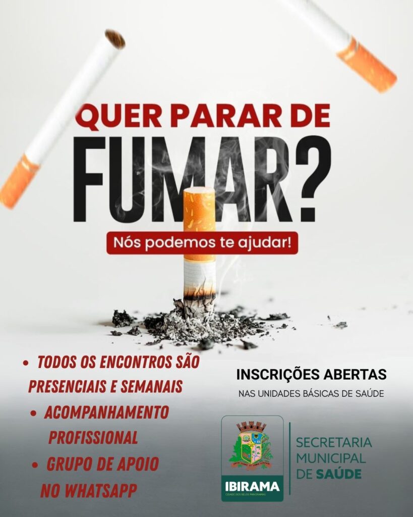 A Secretaria Municipal de Saúde de Ibirama está com inscrições abertas para pessoas que desejam parar de fumar. A iniciativa faz parte das ações de promoção da saúde e prevenção de doenças, oferecendo apoio e acompanhamento para quem quer abandonar o tabagismo. As inscrições iniciam nesta segunda-feira, dia 09 de março, e seguem até o dia 20 de março, e podem ser realizadas nas Unidades Básicas de Saúde do município.