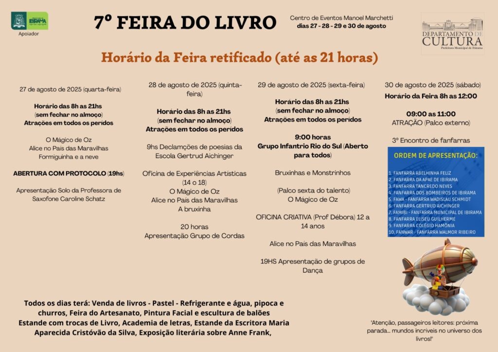 A Prefeitura de Ibirama, por meio do Departamento de Cultura, promove entre os dias 27 e 30 de agosto, no Centro de Eventos Manoel Marchetti, a 7ª edição da Feira do Livro. Neste ano, o evento terá horário das 08h até as 21h, sem pausa para o almoço, oferecendo atrações culturais em todos os períodos. A programação reúne espetáculos teatrais, oficinas, apresentações musicais e de dança, incentivando a leitura e valorizando a cultura em suas diversas formas. Lembrando que a entrada é gratuita.