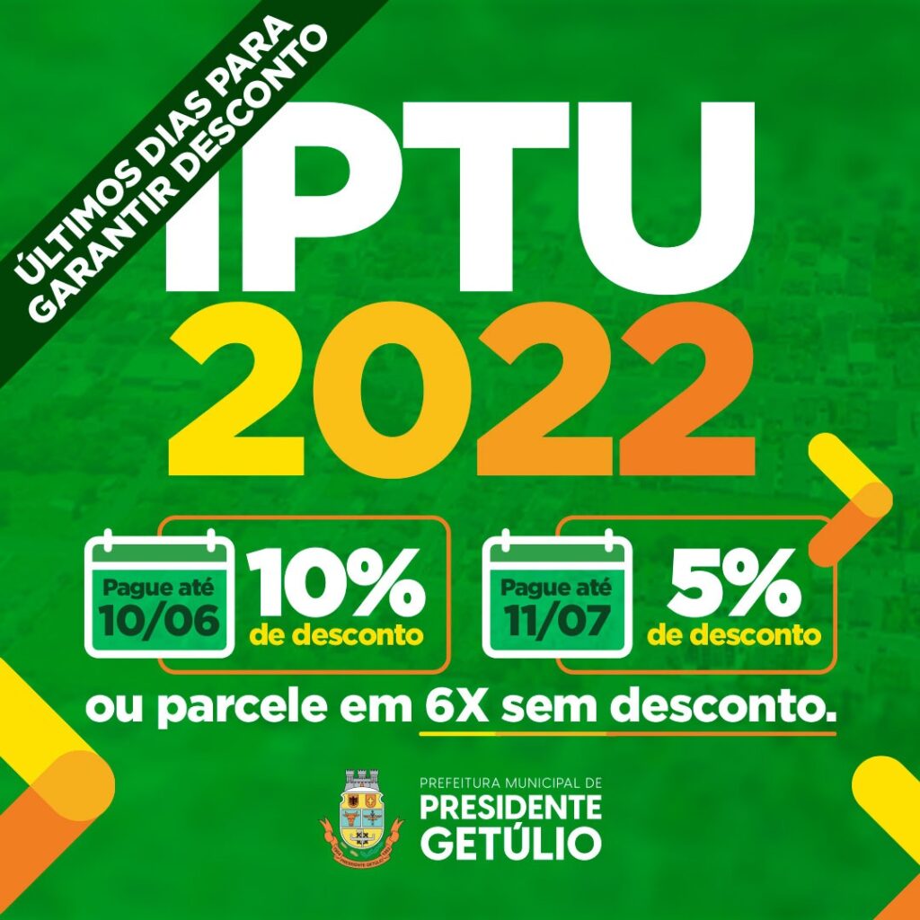 Os contribuintes de Presidente Getúlio têm até sexta-feira (10), para pagar o Imposto Predial e Territorial Urbano (IPTU) de 2022 com 10% de desconto na cota única. Após esta data, ainda será possível ganhar 5% de desconto, para pagamento até 11 de julho.